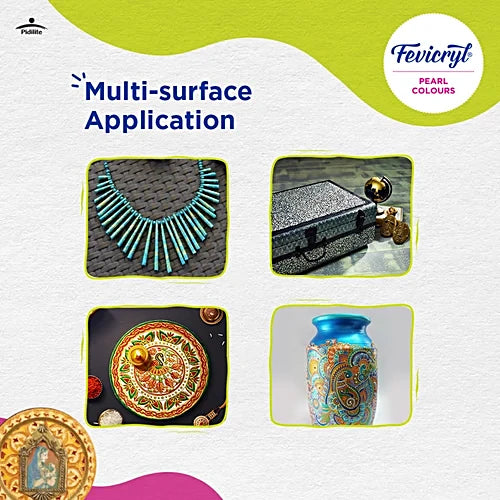 Bring a luminous touch to your artwork with Fevicryl Pearl Acrylic Colours. Infused with a subtle pearlescent sheen, these colours are perfect for adding a rich and radiant effect to your crafts and paintings. Whether you’re decorating fabric, wood, paper, canvas, or even terracotta, these ready-to-use, water-based acrylic paints offer smooth application and a stunning glossy finish.